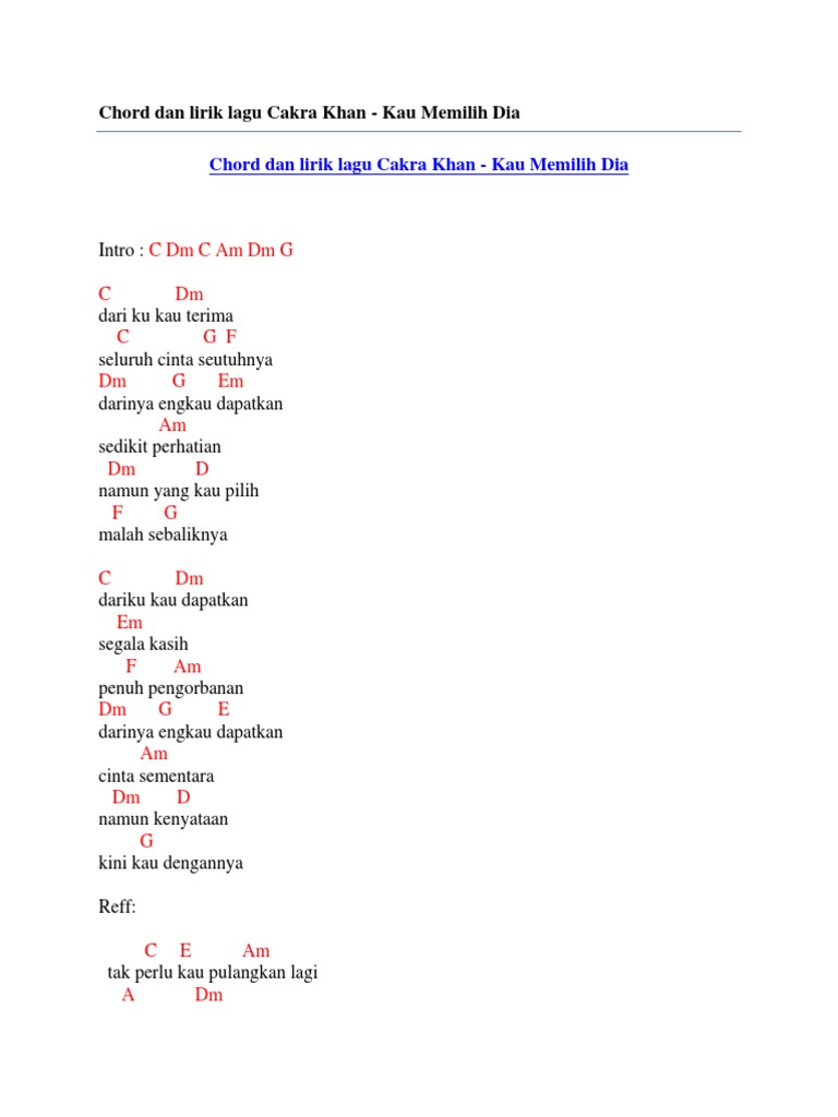 CAKRA KHAN - Kau Memilih DiaDariku kau terimaSeluruh cinta seutuhnyaDarinya engkau dapatkan sedikit perhatianNamun yang kau pilih malah sebaliknyaDariku. Video Kau Memilih Dia - Cakra Khan dari Youtube tersedia dibawah jika Anda lupa atau belum tahu Kau Memilih Dia - Cakra Khan. Cakra Khan Kau Memilih Dia Chord Intro C G Dm Em-F-C Am Dm G C Dm dari ku kau terima C G F seluruh cinta seutuhnya Dm G Em darinya engkau dapatkan Am sedikit perhatian Dm D namun yang kau pilih F G malah sebaliknya C Dm dariku kau dapatkan Em segala kasih F penuh pengorbanan Em Dm G E darinya engkau dapatkan Am cinta sementara Dm D namun kenyataan G kini kau dengannya Chorus C E Am tak perlu kau pulangkan lagi A Dm C semua yang telah aku.